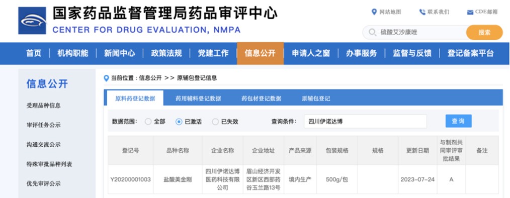 原料藥已順利批準上市,登記號為:“Y20200001003”,登記狀態(tài):“A”